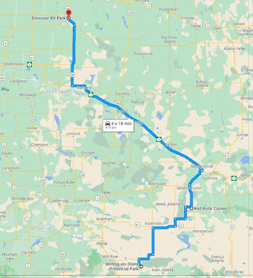 Dan vervolgen we de reis en bij Medicine Hat gaan we links, west dus, Highway 1 op, de ons welbekende Trans Canada Highway, oftewel de TCH. Hier is hij wel supersaai. Dat duurt eeuwen en pas in de buurt van Drumheller wordt het mooi. Daar zijn Badlands ontstaan en deze regio is ook bekend om het feit dat er enorm veel dinosaurusoverblijfselen zijn gevonden en het noemt zich dan ook niet voor niets de Dinosaur Capitol of the World.